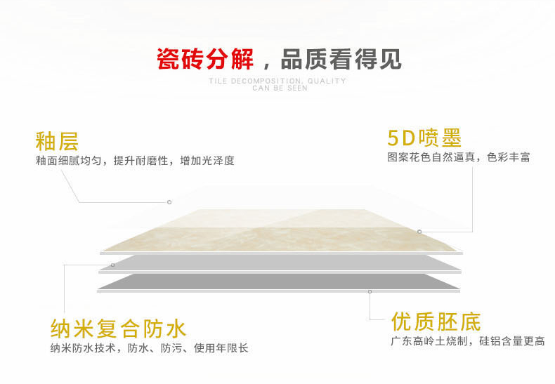 金曼古瓷磚廠家特價金剛石因高品質而得名,是一款極具天然石材效果和微晶石質感的仿石材瓷磚,它不但在價格、環保、耐用和清潔上極具優勢,在質感、規格、花色、重量等指標上,金剛石都遠遠勝于石材、拋光磚。相比其他種類的產品,它最大的特點可以用“高亮度、高耐磨、高平整、高逼真、高清晰、高環?!?。