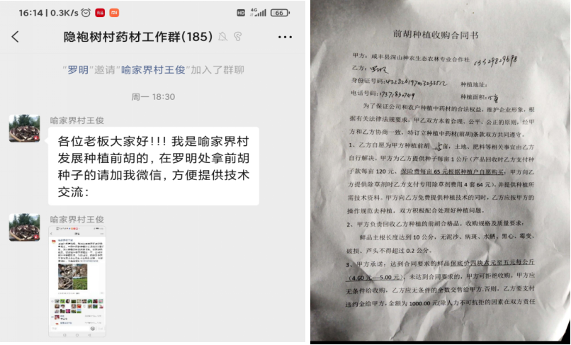 前胡集藥用、食用價值于一身,種植管理簡單、投入成本低、市場價值高,一年即可采挖。為進一步壯大癮皰樹村中藥材種植產業規模,拓寬村民增收渠道,駐村工作隊邀請中藥材種植能手開展線上專業技術培訓,指導村民種植前胡,同時積極幫助村民尋找收購方。通過簽訂前胡種植收購合同,實行藥材種植訂單回購模式,有效打通銷售渠道,解除了村民后顧之憂,極大地促進了村民種植前胡的積極性。