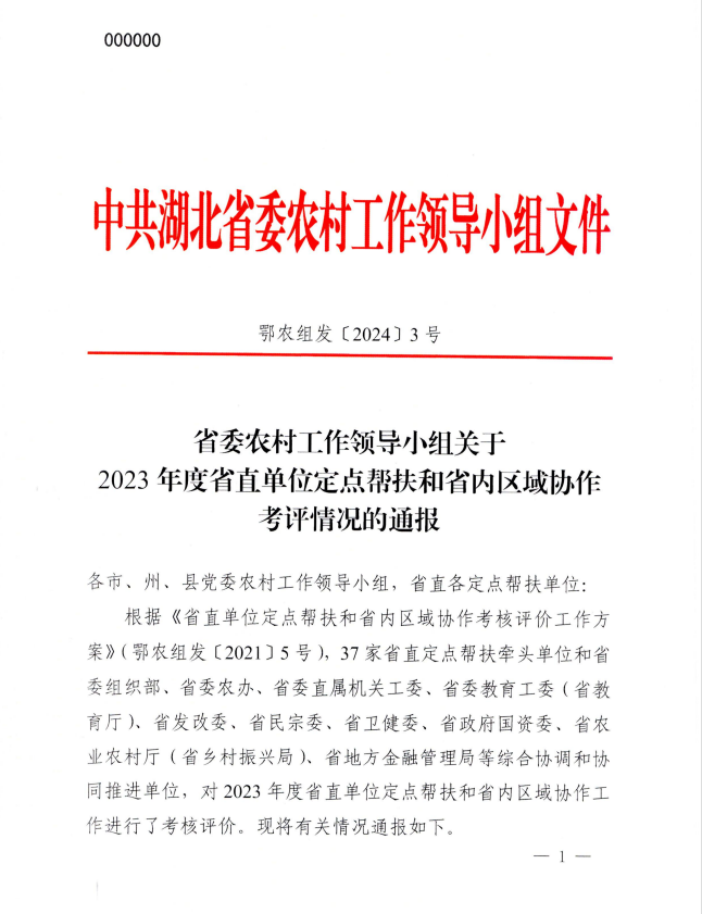 同時,省農業(yè)農村廳印發(fā)的省委組織部、省委農辦、省農業(yè)農村廳《關于表揚2023年度省派駐村工作先進集體和先進個人的通報》(鄂農發(fā)[2024]21號),湖北清能投資發(fā)展集團有限公司榮獲“2023年度工作突出派出單位”。